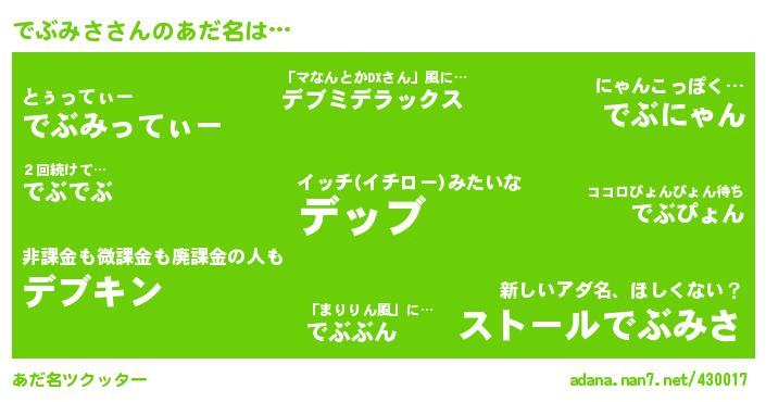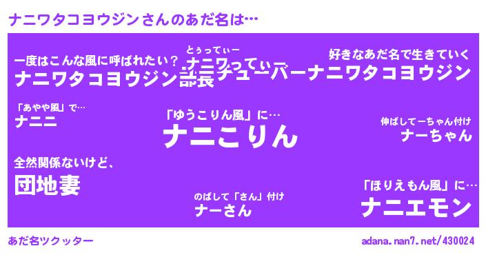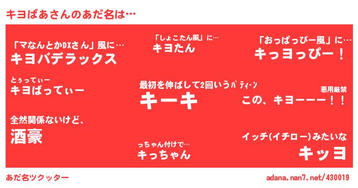 | 2回繰り返すあだ名 | 『ススチチ』『ちゅーちゅー』『にゃーにゃー』『わきわき』 |