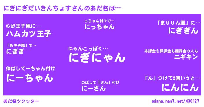 | ピコ太郎風あだ名 | 『ピナ二郎』『ピコナ郎』『ナコ五郎』『ナカ太郎』『ナナ太郎』 |