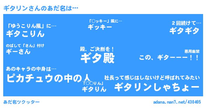| ピコ太郎風あだ名 | 『ピコタ郎』『タナ六郎』『タタ太郎』『ピタ太郎』『タコ次郎』 |