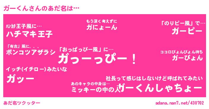 | 2回繰り返すあだ名 | 『ごしごし』『ちゃちゃ』『しょりしょり』『ちちゃゃ』 |