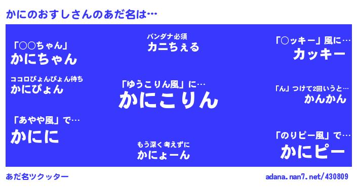 | 意味不明あだ名 | 『とにかく怪しいかにのおすし』『住所不定無職かにのおすし(79歳)』 |