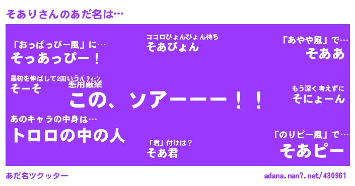| ヘコむあだ名 | 『そあふぇ~』『豆乳』『そあぷりん』『そあり(小並感)』 |