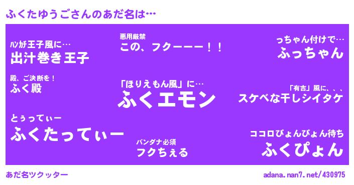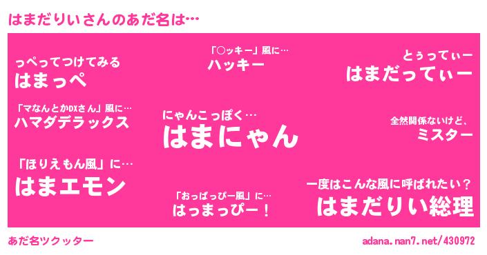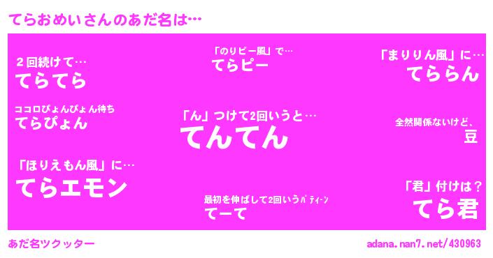 | ピコ太郎風あだ名 | 『ピコケ郎』『ケコ六郎』『ケン四郎』『ピケ太郎』『ケケ太郎』 |