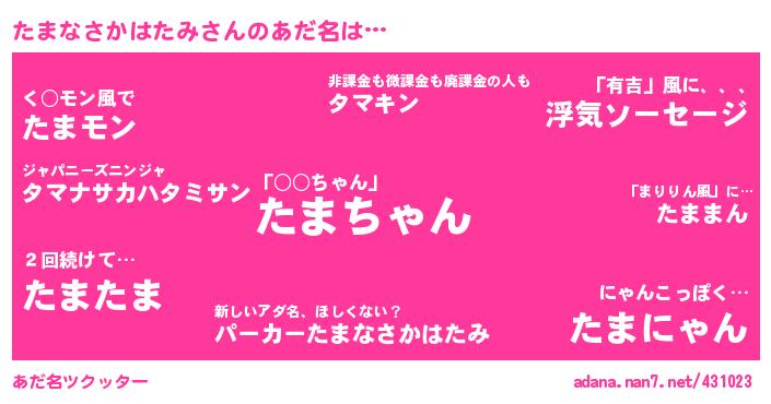 | 意味不明あだ名 | 『永久保存たまなさかはたみ』『たまなさかはたみフォーエバー』 |