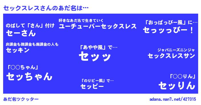 | ヘコむあだ名 | 『セッふぇ~』『豆乳』『セッぷりん』『セックスレス(小並感)』 |