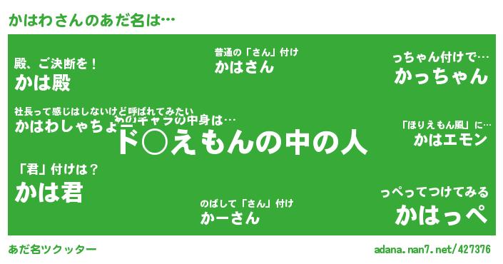 | 男性向けラノベタイトル風あだ名 | 『かはわの嫁は女の子じゃないと思った?』『冴えないかはわの育てかた』 |