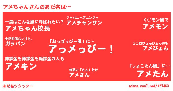 | 女子向けラノベタイトル風あだ名 | 『死神アメちゃんの再婚』『アメちゃん姫と円卓の騎士』 |