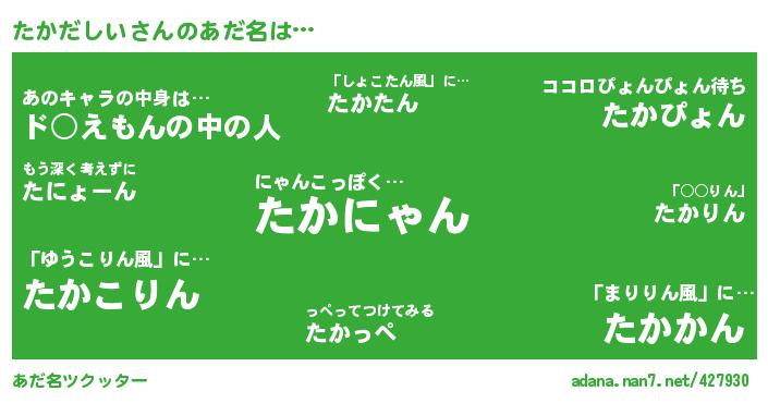 | 男性向けラノベタイトル風あだ名 | 『タカダシイアートオンライン』『魔弾の王とたかだしい』 |
