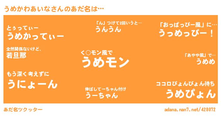 | ポケモン風あだ名 | 『ウメカダネ』『ヒウメカワアイナ』『ウックウザ』『ゼニウメ』 |
