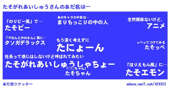 | ヘコむあだ名 | 『たそふぇ~』『豆乳』『たそぷりん』『たそがれあいしゅう(小並感)』 |