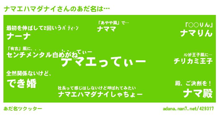 | ヘコむあだ名 | 『ナマふぇ~』『豆乳』『ナマぷりん』『ナマエハマダナイ(小並感)』 |