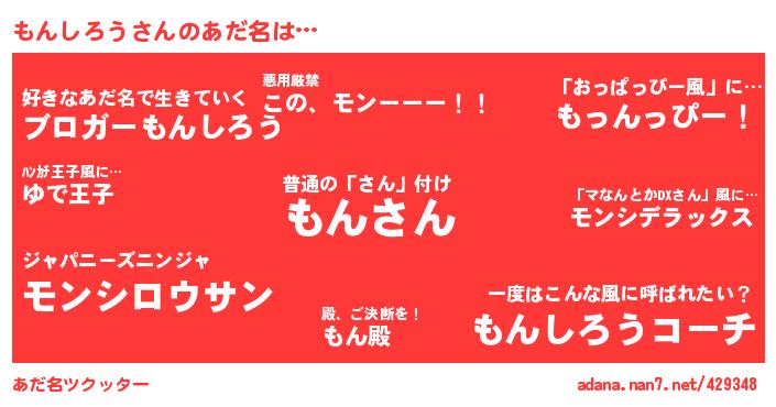 | ポケモン風あだ名 | 『モンシダネ』『メロモッン』『ヒモンシロウ』『モンセウス』 |