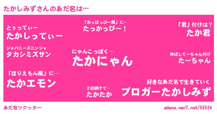 | 男性向けラノベタイトル風あだ名 | 『ノーゲーム・ノータカシミズ』『魔法科高校のたかしみず』 |