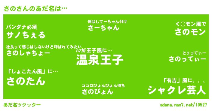 | ヘコむあだ名 | 『さのふぇ~』『豆乳』『さのぷりん』『さの(小並感)』 |