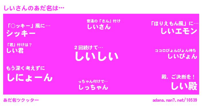 | ヒーロー風カッコイイあだ名 | 『ウルトラしいマン』『友情の使者しい』『ネオシイ』 |