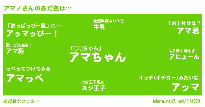 | 男性向けラノベタイトル風あだ名 | 『アマノに滅ぼされるだけの簡単なお仕事です』『転生したらアマノだった件』 |