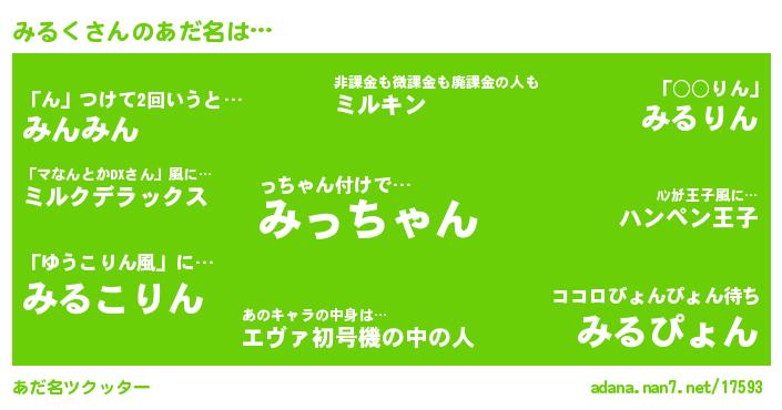 ポケモン風あだ名 | 『ゼニミル』『ミルキング』『ミックウザ』『メロミッル』 |