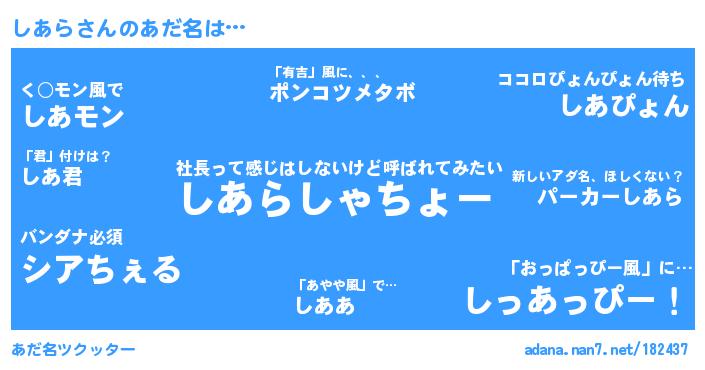 | 男性向けラノベタイトル風あだ名 | 『しあらの嫁は女の子じゃないと思った?』『転生したらしあらだった件』 |