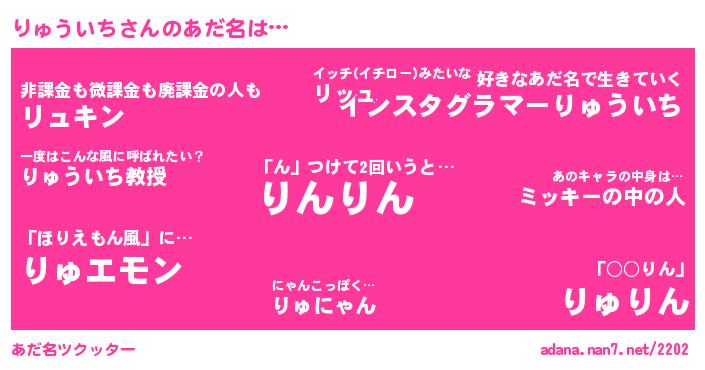 | 意味不明あだ名 | 『ペロリンりゅういち』『永久保存りゅういち』『自称りゅういち』 |