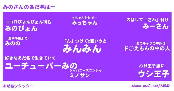 | ヘコむあだ名 | 『みのふぇ~』『豆乳』『みのぷりん』『みの(小並感)』 |