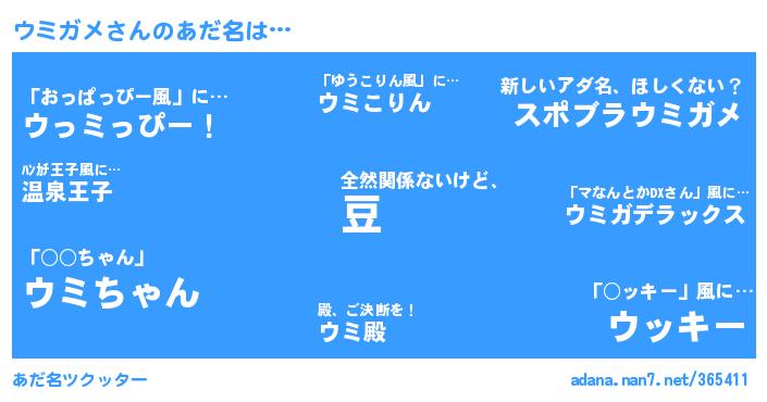| ポケモン風あだ名 | 『ウミガダネ』『ゼニウミ』『ウーミイ』『ウミゴンZ』 |