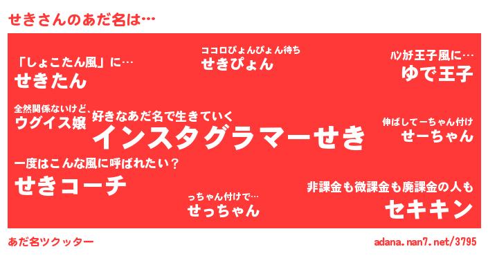 | ヘコむあだ名 | 『せきふぇ~』『豆乳』『せきぷりん』『せき(小並感)』 |