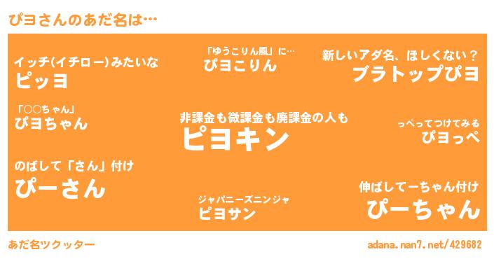 | ヘコむあだ名 | 『ぴヨふぇ~』『豆乳』『ぴヨぷりん』『ぴヨ(小並感)』 |