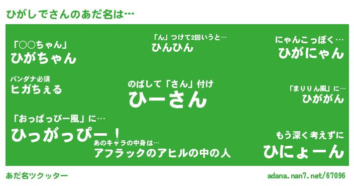 ヒーロー風カッコイイあだ名 | 『ネオヒガシデ』『仮面ヒガダー』『スーパーヒガシデ』 |