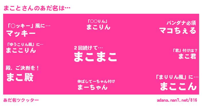 | 女子向けラノベタイトル風あだ名 | 『まこと様がみてる』『まこと伯爵の花嫁』『まことの契約王妃』 |