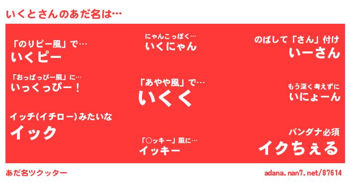 | ヒーロー風カッコイイあだ名 | 『ウルトラいくとマン』『魔戒騎士イク』『仮面イクダー』 |