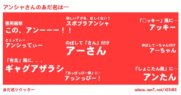 | 男性向けラノベタイトル風あだ名 | 『ノーゲーム・ノーアンシャ』『アンシャという概念が存在しない退屈な世界 』 |