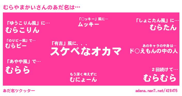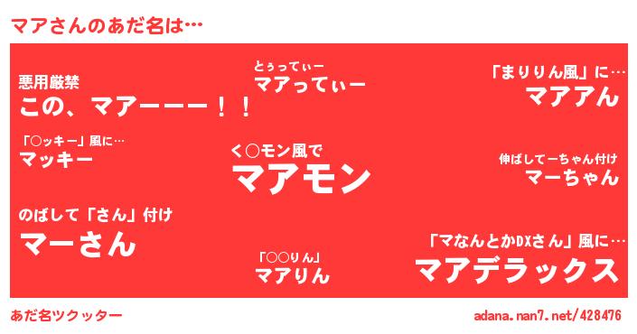 | ポケモン風あだ名 | 『メロマッア』『マアキング』『ヒマア』『マアダネ』 |