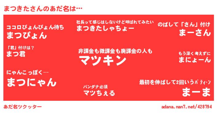 | 男性向けラノベタイトル風あだ名 | 『Re:まつきたから始める異世界生活』『まつきたの憂鬱』 |