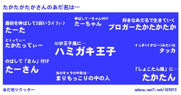 | 女子向けラノベタイトル風あだ名 | 『異世界でカフェたかたかたかを開店しました。』『たかたかたか恋絵巻』 |