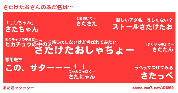 | 意味不明あだ名 | 『自称さたけたお』『永久保存さたけたお』『眠気覚ましガムさたけたお味』 |