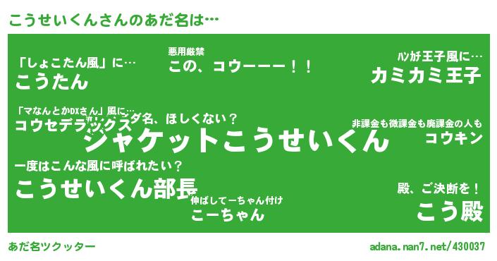 | 男性向けラノベタイトル風あだ名 | 『コウセイクンアートオンライン』『はたらくこうせいくんさま!』 |